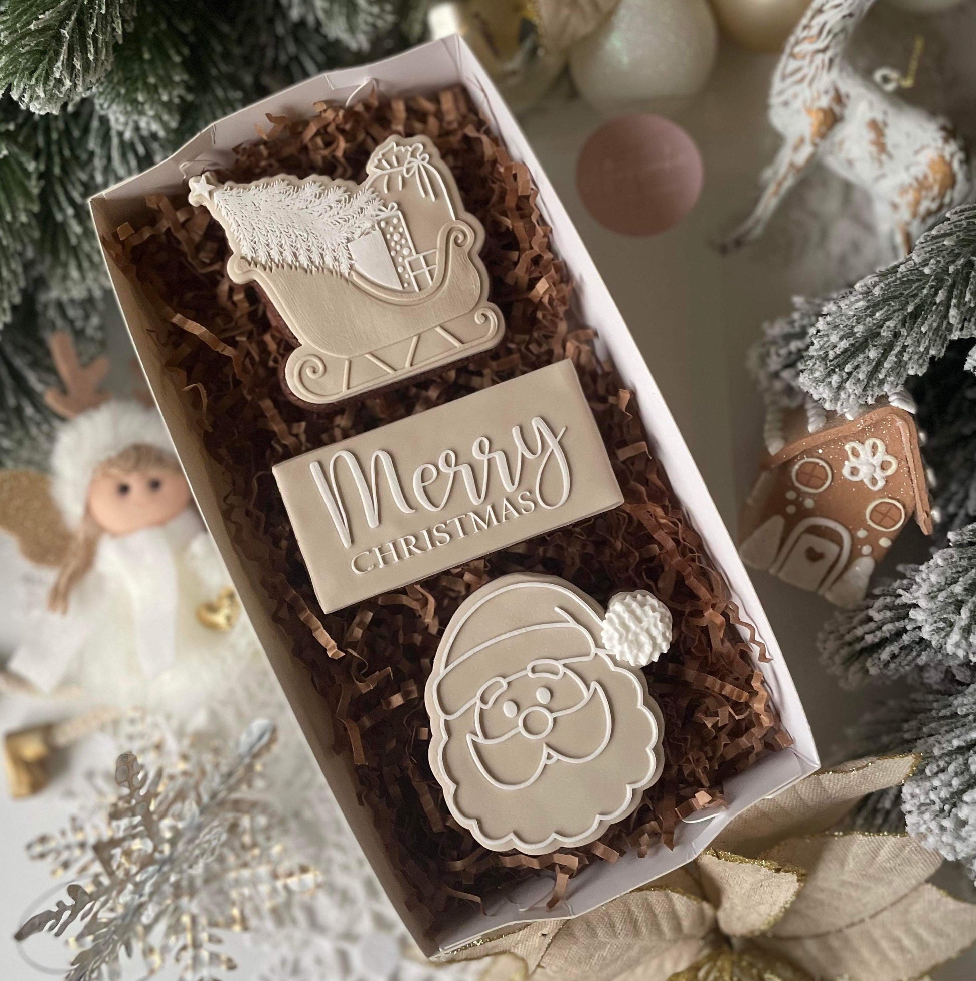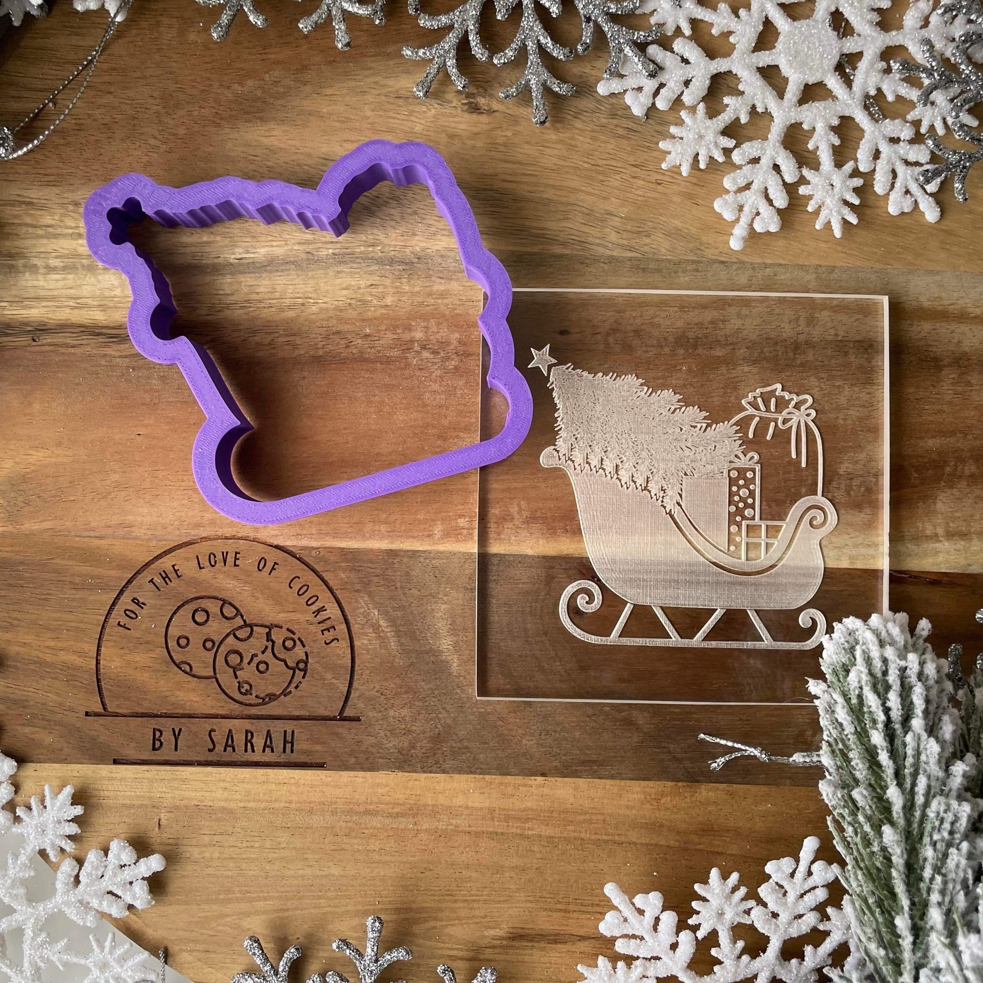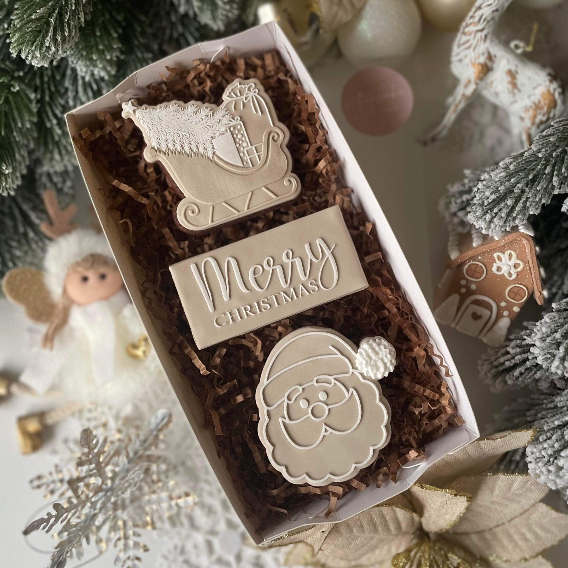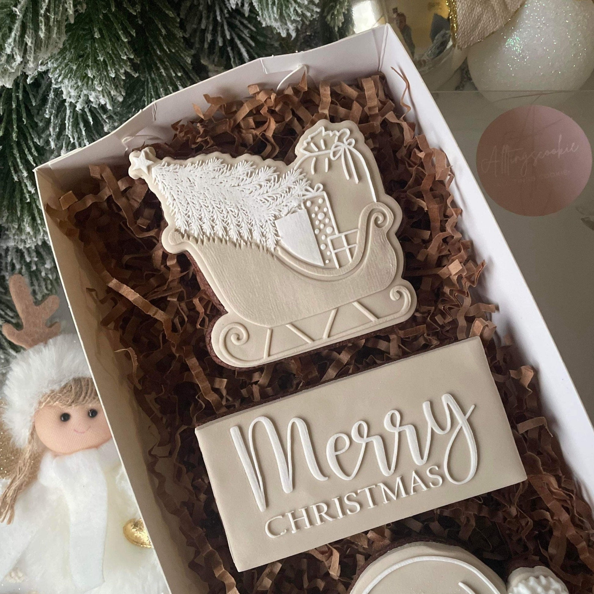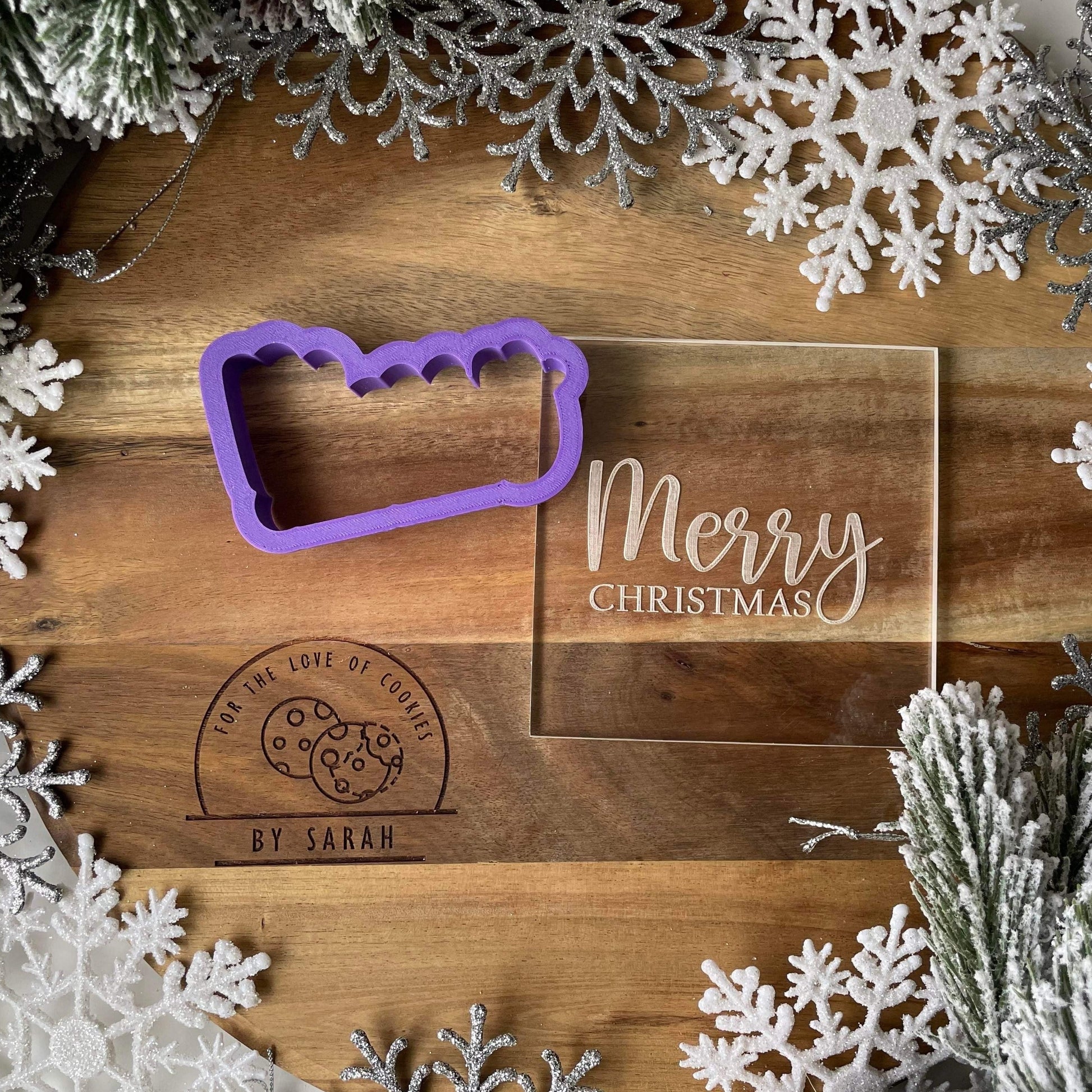 Please note: the Merry Christmas cutter shown next to the acrylic debosser is included. A different cutter was used in the cookie photos (not included).